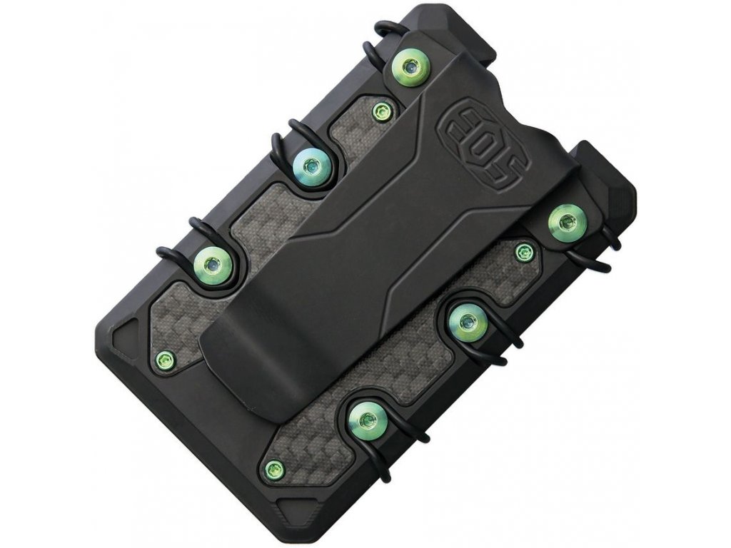 The EOS 3.0 wallet is CNC machined from titanium with inserts that enhance the aesthetics and overall comfort of the design. The wallet consists of two plates held together by six O-rings and stainless steel hardware. This design works well because the O-rings constantly maintain tension on the contents inside the wallet and can accommodate a variety of bills and cards. The wallets can hold the equivalent of 20 cards, or 20 cards alone, or 10 cards and 20 bills, or up to 50 bills alone. The contents can be accessed via a thumb hole, which acts as an opener, and the contents of the wallet can be partially ejected. The item(s) are then easily removed by pressing the opposite side of the wallet, which unfolds everything inside, and making a withdrawal. When finished, simply slide the contents back into the wallet.