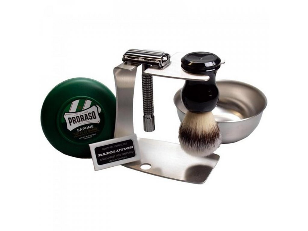 Vysoce kvalitní holicí souprava RAZOLUTION, 6dílná s holícím strojkem, holicí štětkou, holicím stojánkem, 10ks žiletek, holicí miska a holicí mýdloKompletní sada obsahuje:1. 1 x strojek TwinTop - délka rukojeti 8 cm - Butterfly-Technique - Barva: černá chromovaná2. 1 x holící štětka ze stříbrných vláken, ne-zvířecí srst (veganské) - , bez zápachu, průměr hlavy: 21 mm - výška: 105 mm - výška vláken: 55 mm - rukojeť z černého plastu3. 1 x stojánek z nerezavějící oceli - 3 pozice pro strojek, štětku, kartáček na zuby - Rozměry: o 107x65 mm - výška: 100 mm - tloušťka: 2 mm4. 10 x žiletek - nerezová ocel - teflonem potažené - balené v praktickém dávkovači5. 1 x nerezová nádoba na holení - průměr 110 mm - výška: 40 mm - nerezová ocel 6. 1 x mýdlo na holení ProRaso - vysoce kvalitní mýdlo v kelímku - Množství: 150ml (147g)Buďte první, kdo napíše příspěvek k této položce.