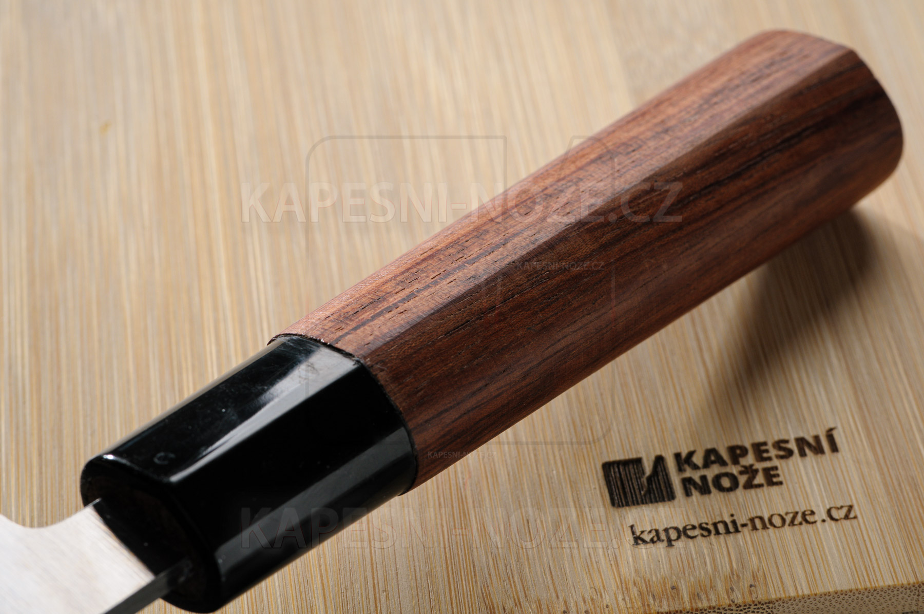 Rukojeť z růžového dřeva dodává noži nejen estetickou hodnotu, ale také vynikající ergonomii, což zajišťuje pevný úchop a pohodlnou manipulaci i při dlouhodobém používání. Pevná konstrukce a ideální vyvážení podporují přesnou práci a minimalizují únavu ruky. Díky kombinaci vyspělých materiálů, tradičního designu a řemeslného zpracování představuje tento Gyuto spolehlivý nástroj pro každého, kdo si potrpí na kvalitu a výkon profesionálního kuchyňského nože.