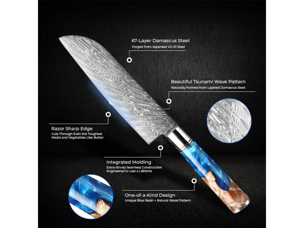 Celkové zpracování odpovídá nárokům moderní gastronomie, kde se spojuje výkon, estetika a dlouhodobá spolehlivost. Nůž zvládá každodenní práci v kuchyni bez kompromisů a zároveň působí jako designový prvek. Tsunami Santoku Knife představuje kombinaci technické preciznosti, japonské oceli a moderního řemesla pro náročné uživatele.