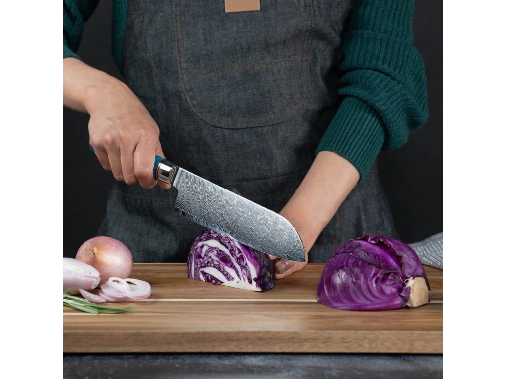 Profil santoku čepele podporuje univerzální použití v kuchyni, od krájení zeleniny přes porcování masa až po jemné sekání bylinek. Širší čepel umožňuje efektivní přenos síly a zároveň usnadňuje manipulaci s nakrájenými surovinami. Plynulý průchod materiálem omezuje přilnavost potravin k povrchu. Santoku patří mezi nejuniverzálnější kuchyňské nože díky své geometrii a vyváženému tvaru.