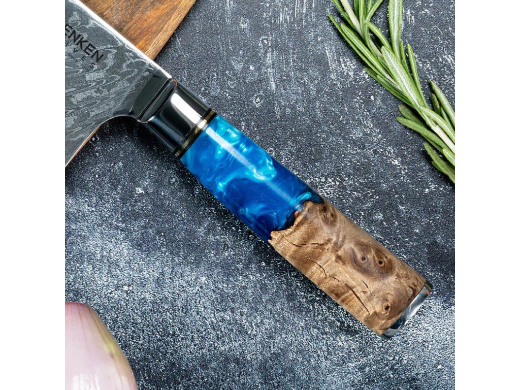 Rukojeť kombinuje stabilizované přírodní dřevo s modrou pryskyřicí, což vytváří nejen výrazný vizuální efekt, ale i odolnou strukturu vhodnou pro kuchyňské prostředí. Materiál odolává vlhkosti, teplotním změnám i běžnému opotřebení. Protiskluzový povrch podporuje jistý úchop a přesnou kontrolu při práci. Bezešvé spojení čepele s rukojetí eliminuje slabá místa a zvyšuje hygienu při používání. Každá rukojeť vzniká unikátním procesem, díky čemuž má každý nůž originální vzhled bez opakování vzoru.
