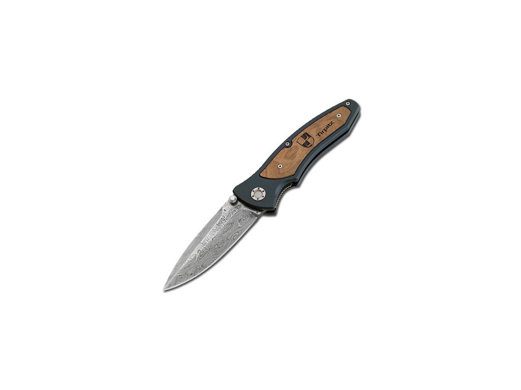 Rukojeť vyrobená z vysoce pevného hliníku AlMgSi1 (s příměsí křemíku, díky čemuž je mnohem kvalitnější než standardní AlMg3) je tvrdě eloxovaná a poskytuje pevný a bezpečný úchop. Oboustranný klip umožňuje nošení ve výklopném nebo sklopném stavu. Pro vložku rukojeti jsme zvolili domácí ořech, který má díky svým vynikajícím vlastnostem dlouhou historii jako střenkové dřevo pro německé pušky. Tato poutavá intarzie je navíc opatřena originálním znakem Tirpitz. Tento nůž v sobě více než jedinečným způsobem spojuje historii, tradici a moderní technologie. Dodává se kompletní v prezentační krabičce s certifikátem pravosti a je sériově číslovaný.