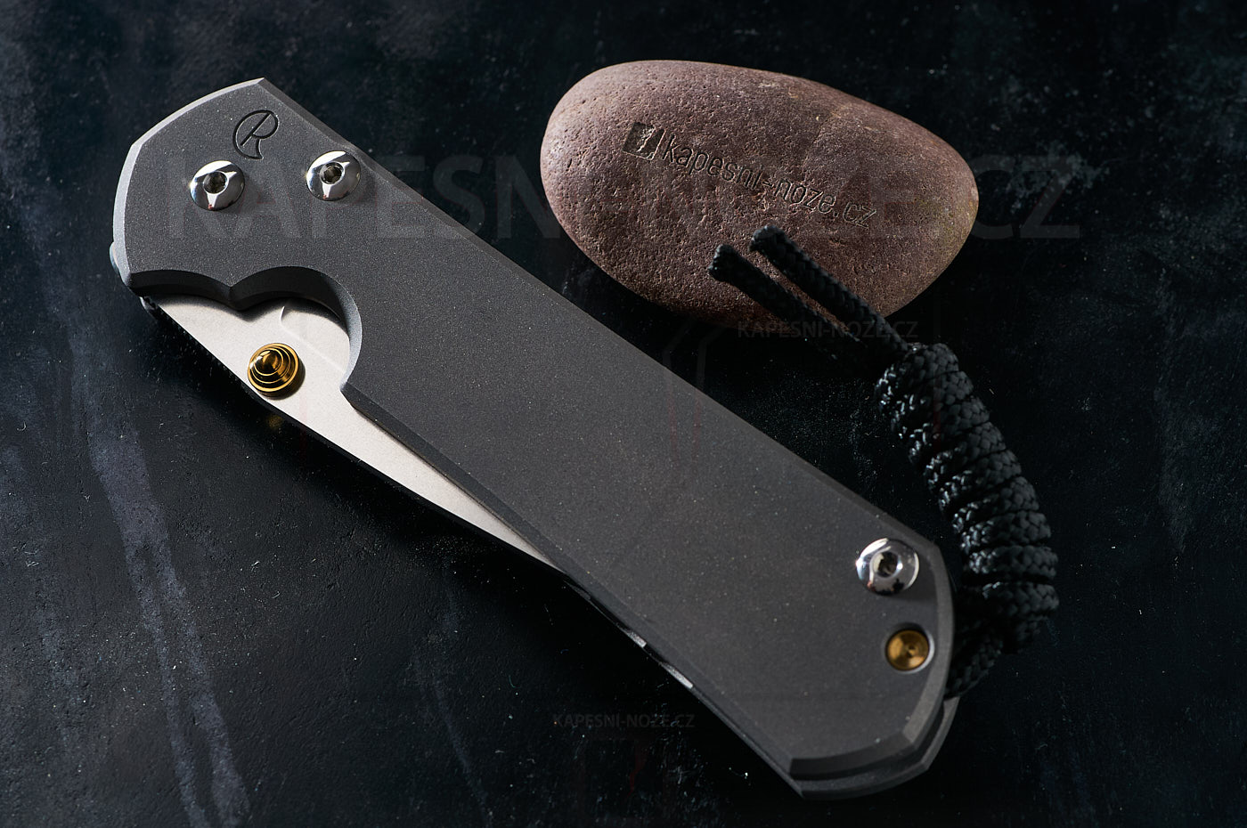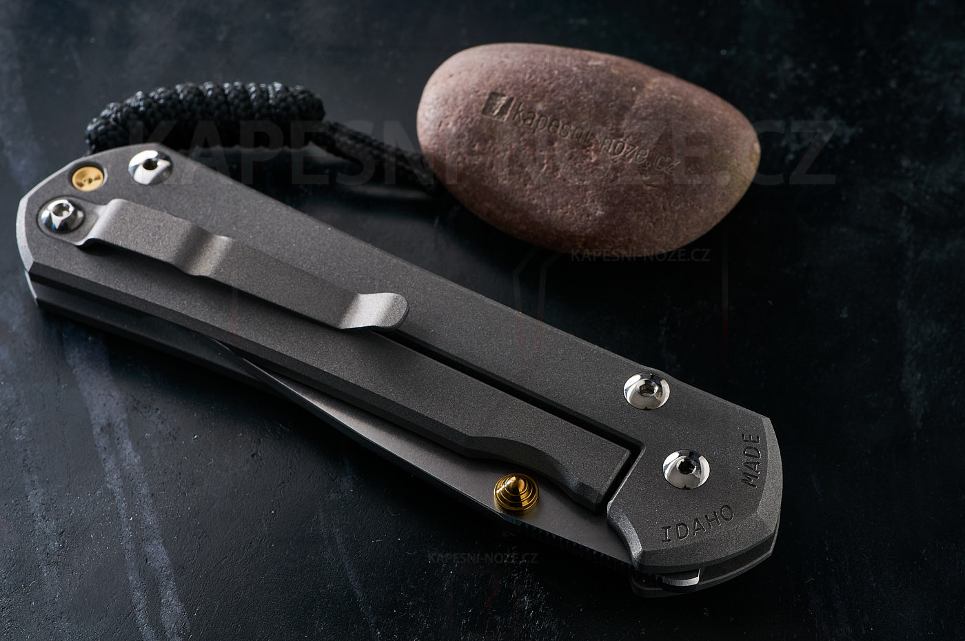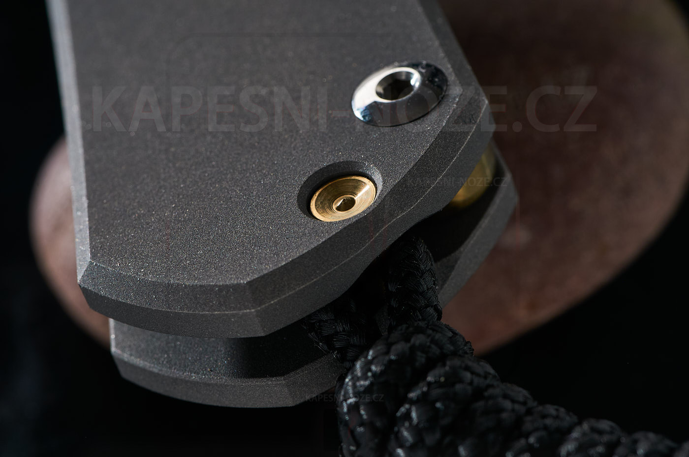 Zlacené oboustranné kolíky zajišťují pohodlné otevření palcem z kterékoliv strany, a zároveň vytvářejí kontrastní detail proti titanovým střenkám. Tento malý, ale funkční prvek často zaujme už při prvním uchopení, protože ladně zapadá do čisté linie celé konstrukce.