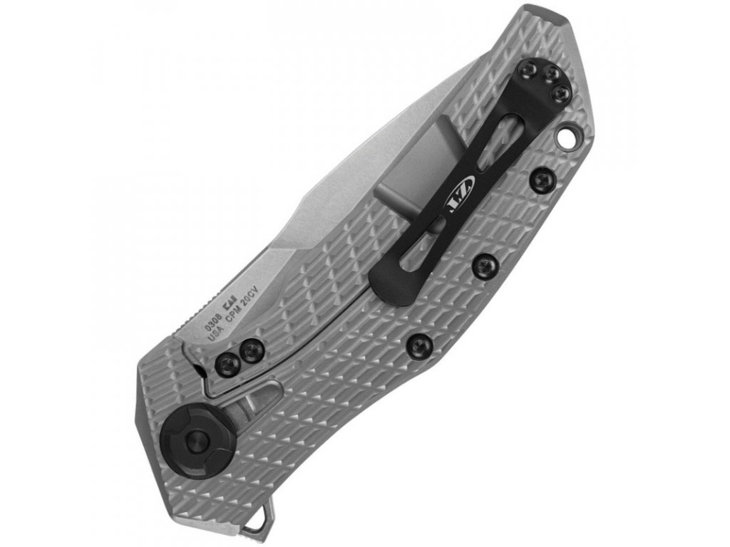 Model 0308 se otevírá pomocí systému kuličkových ložisek KVT společnosti ZT a je zajištěn robustním zámkem rámu. Kapesní klip je oboustranný pro pravou/levou ruku, když chcete velký nůž, je ZT0308 ten pravý.