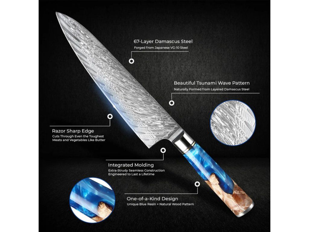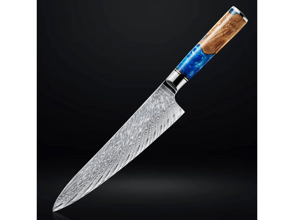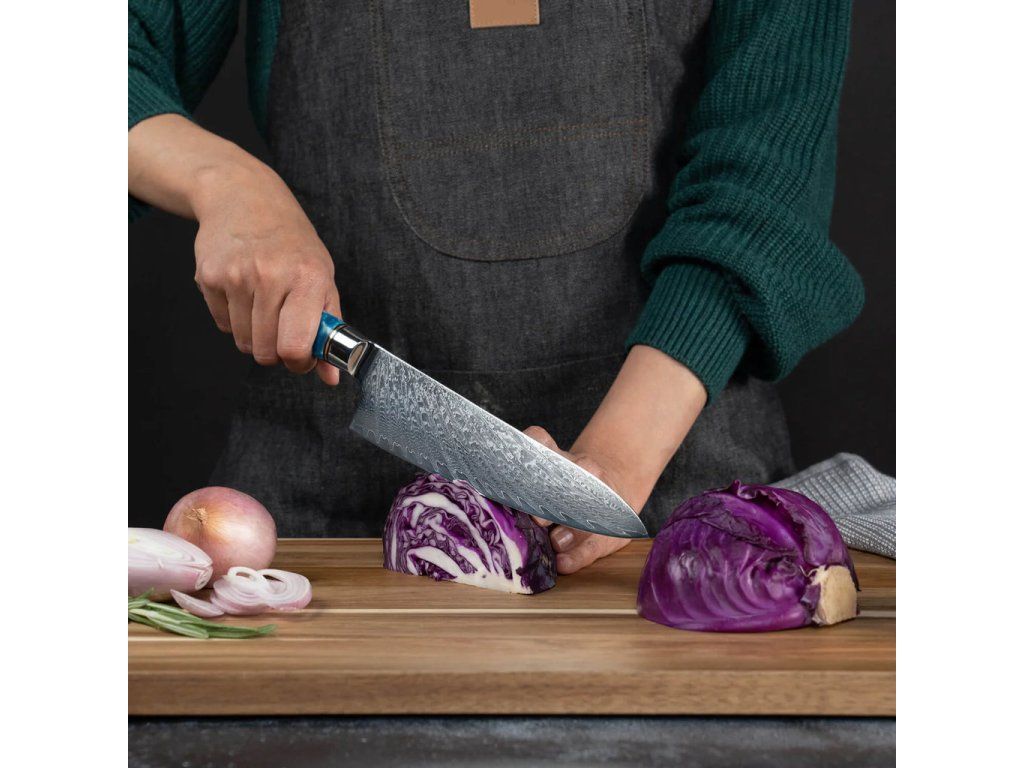 Rukojeť kombinuje stabilizované přírodní dřevo s modrou pryskyřicí, což vytváří nejen výrazný vizuální efekt, ale i odolnou strukturu vhodnou pro kuchyňské prostředí. Materiál odolává vlhkosti, teplotním změnám i běžnému opotřebení. Protiskluzový povrch podporuje jistý úchop a přesnou kontrolu při práci. Bezešvé spojení čepele s rukojetí eliminuje slabá místa a zvyšuje hygienu při používání. Každá rukojeť vzniká unikátním procesem, díky čemuž má každý nůž originální vzhled bez opakování vzoru.