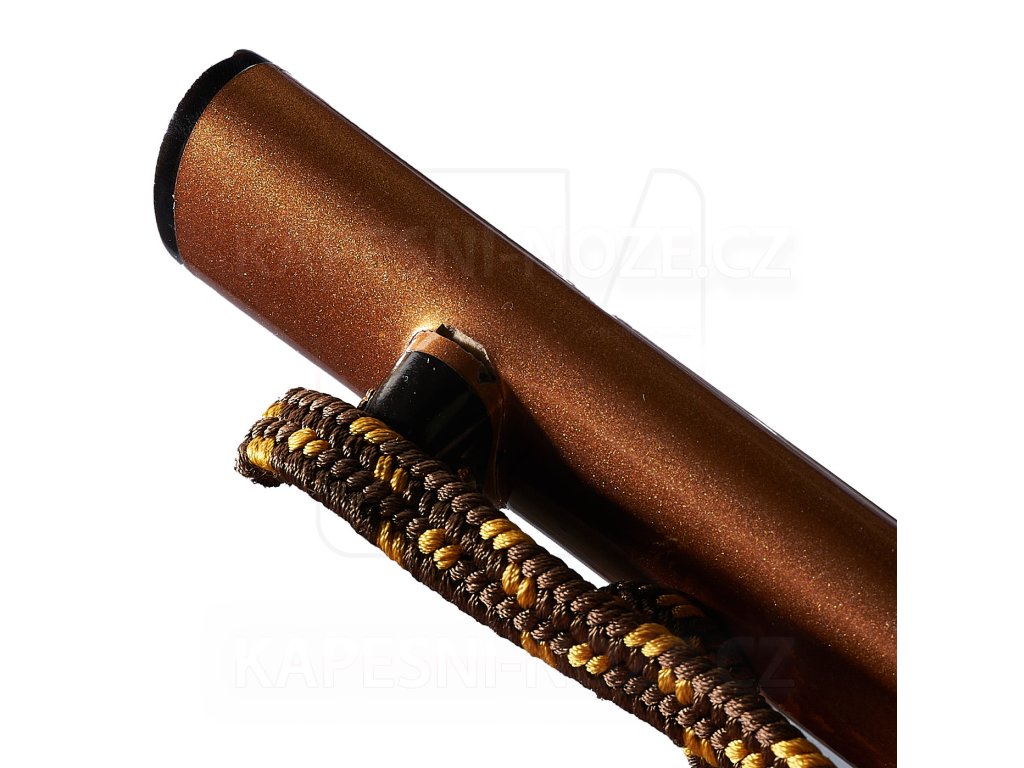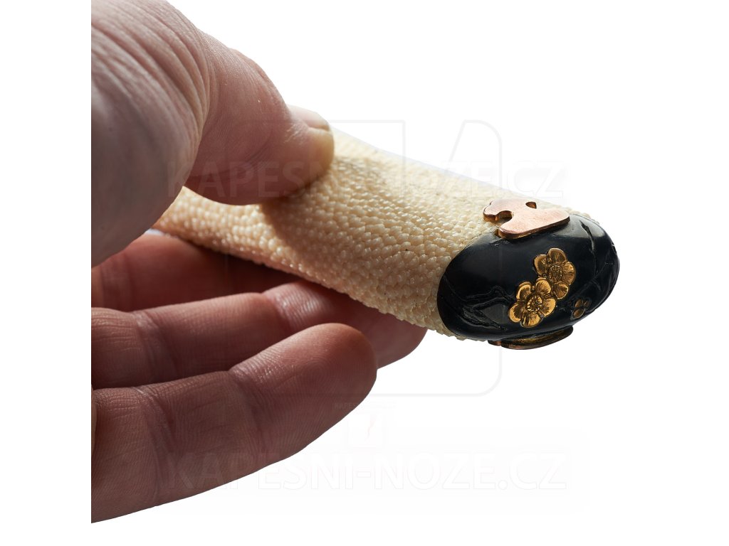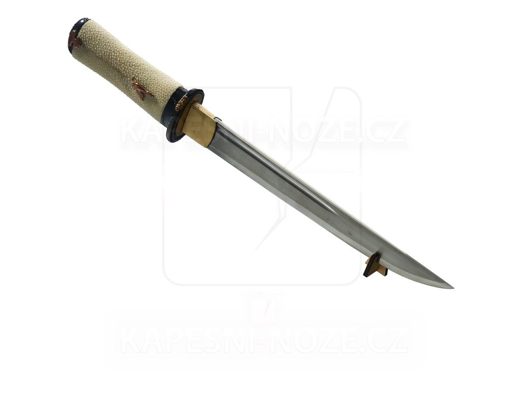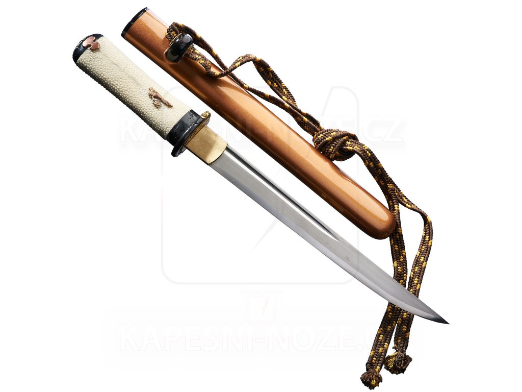 Krásné a funkční tanto s motivem švestkových květů je lehké do ruky a pevně se drží za rukojeť z rejnočí kůže. Jemně propracované pozlacené menuky a akcenty ve tvaru orlice dokládají Frenchieho smysl pro detail u všech návrhů Dragon King. Zářivě zlatá saya a hnědé a zlaté sageo k sobě krásně ladí a díky tomu by se Baika Tanto mohlo stát skvělým doplňkem ke kataně Tatsumaki.