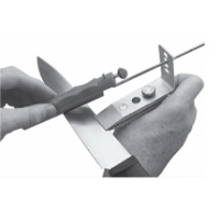 3. BROUŠENÍ nože: Vyberte odpovídající brousek (na zničené nože hrubší, na nůž v slušném stavu jemnější) a naneste malou vrstvu honovacího oleje. Poté protáhněte vodítko otvorem odpovídajícího úhlu a začněte brousit. Broušení provádíme táhnutím brousku pouze proti ostří nože postupně po celé délce. Využíváme brousky podle potřeby od coarse (hrubý) či médium až po fine (jemný) či ultra fine (velmi jemný). Po nabroušení obou stran čepele je nůž opět ostrý.