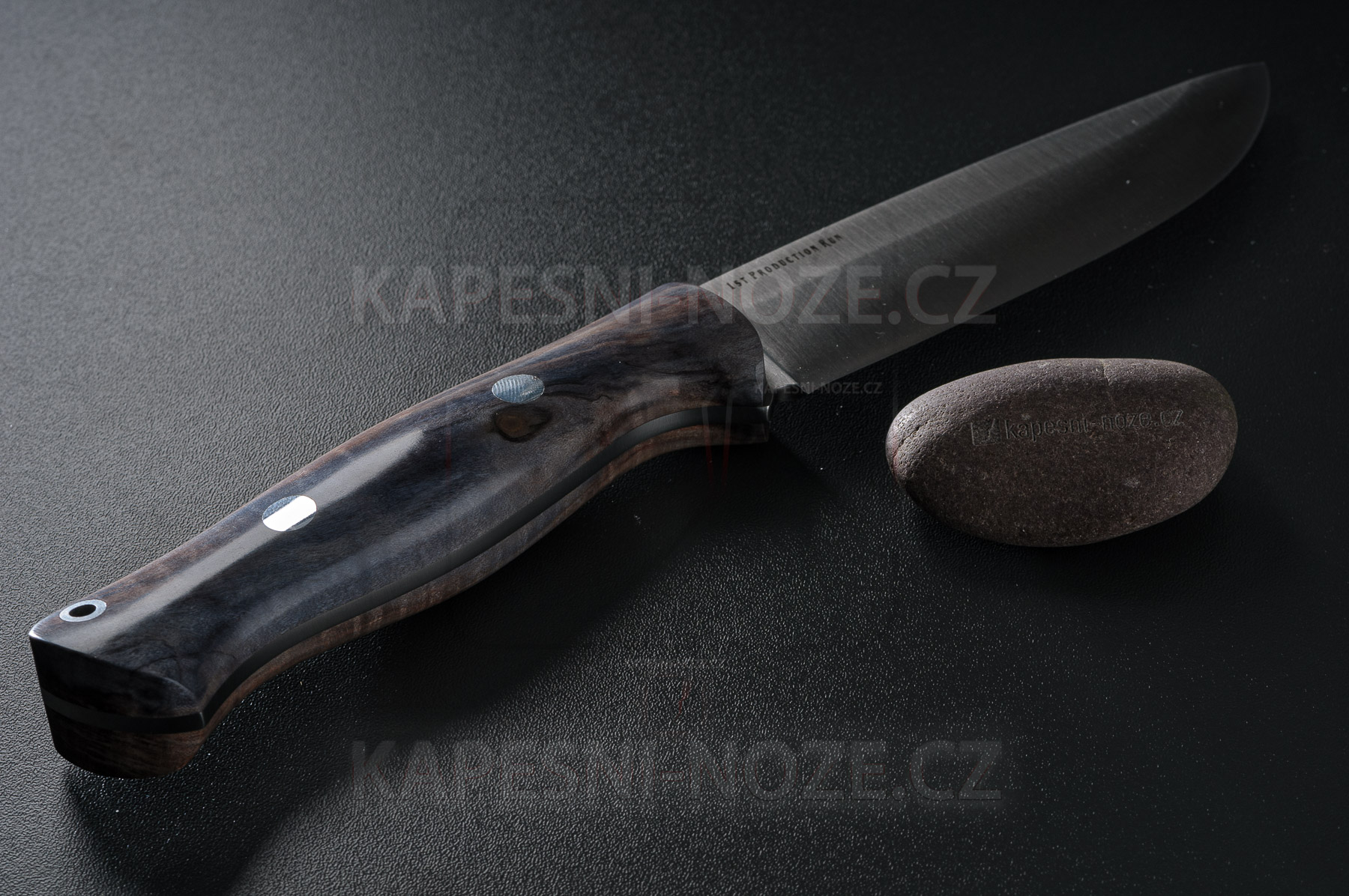Rukojeť z exotického dřeva javorového kořenového suků ("Maple Burl"), mořeného do odstínu Blue Salmon, poskytuje nejen atraktivní vzhled s unikátní kresbou, ale zároveň zaručuje příjemný úchop i v chladných a vlhkých podmínkách. Ergonomické tvarování rukojeti umožňuje pevný a jistý úchop v různých pozicích, což ocení zejména ti, kdo pracují s nožem delší dobu. Při spojení čepele a rukojeti je použit plný trn (full tang) s precizním lícováním, které zvyšuje celkovou odolnost konstrukce bez zbytečných kompromisů.