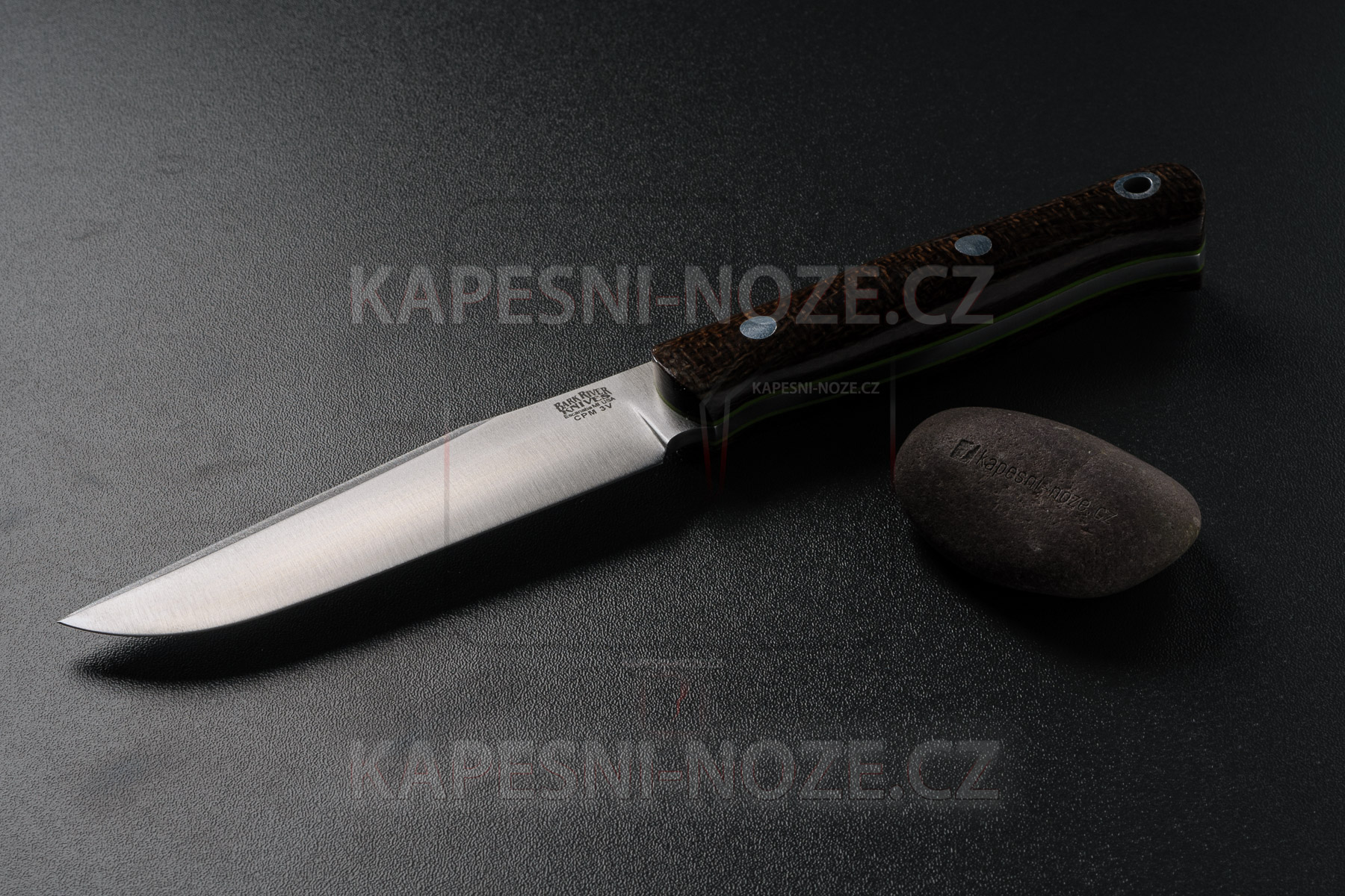Rukojeť z materiálu Tan Burlap Micarta, vrstvené přírodní tkaniny impregnované pryskyřicí, poskytuje spolehlivý úchop i ve vlhkém prostředí. Přirozeně texturovaný povrch se s postupem času mírně leští, čímž získává charakteristickou patinu bez ztráty přilnavosti. Toxic Green Liners vytvářejí výrazný vizuální kontrast a dodávají noži moderní a osobitý vzhled. Mosazné čepy nejen zajišťují pevné spojení konstrukce, ale zároveň přidávají decentní estetický akcent.