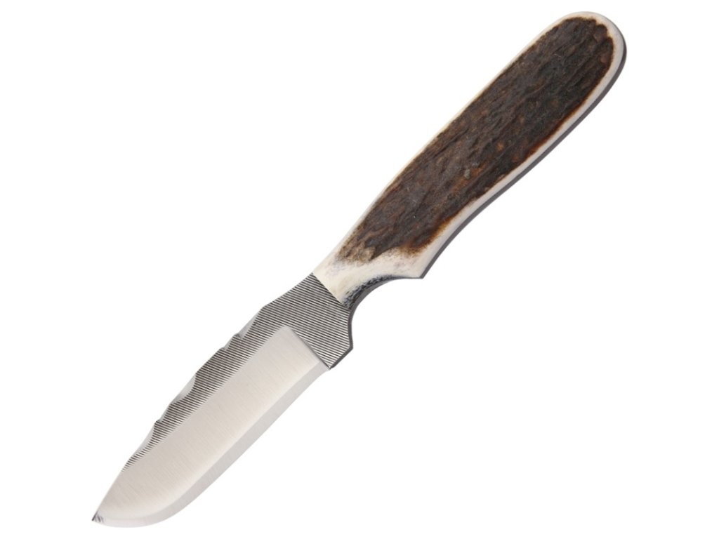 Celková délka 18 cm. Délka čepele 9 cm. Leštěná čepel, rukojeť z losího parohu. Hnědé kožené pouzdro.