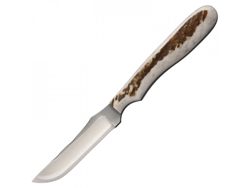 Celková délka 18 cm. Délka čepele 8 cm. Leštěná čepel, rukojeť z losího parohu. Hnědé kožené pouzdro.