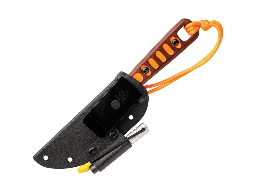 Nůž je vybaven praktickým oranžovým příslušenstvím, zahrnujícím třídílný křesadlový set pro rozdělávání ohně a nouzovou píšťalku s hlasitostí 126 dB pro přivolání pomoci v krizových situacích.