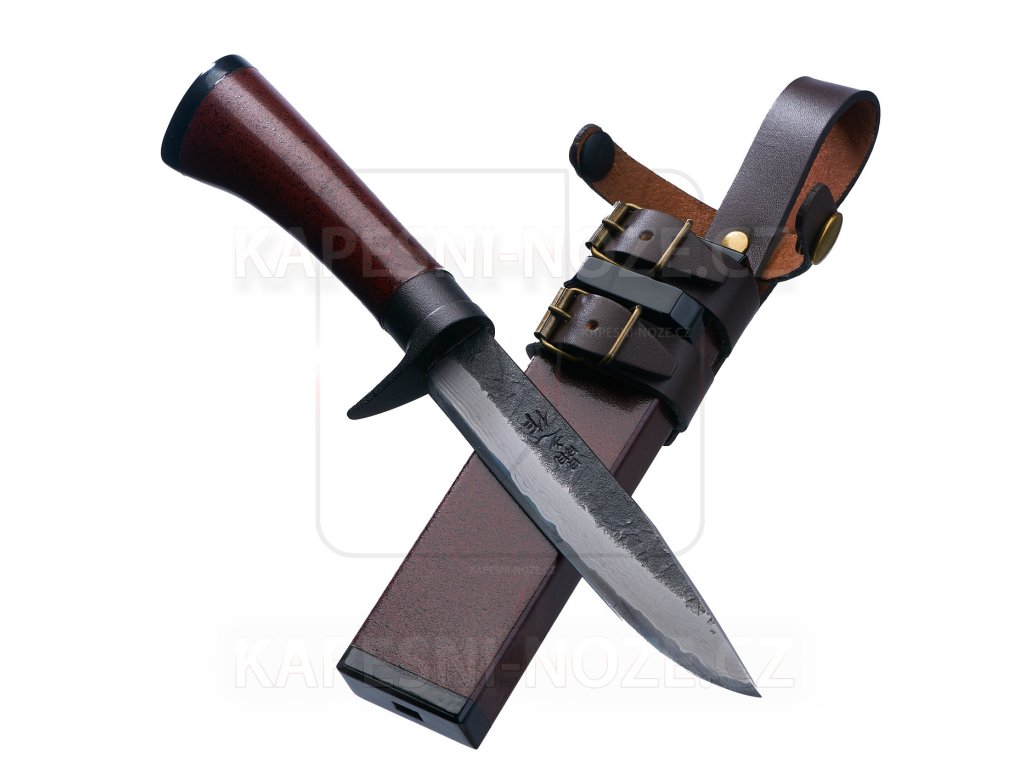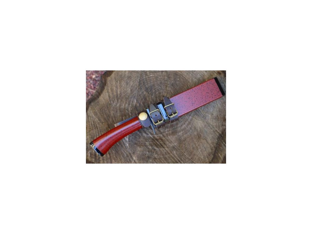 Součástí výbavy zůstává lakované dřevěné pouzdro s jednostrannou povrchovou úpravou ve stejném červeno-černém kamenném motivu. Pouzdro chrání čepel při přenášení, přičemž kožený pásek v tmavém čokoládovém odstínu umožňuje pohodlné nošení a zavěšení. Celek působí uceleně, řemeslně poctivě a osloví jak milovníky japonské estetiky, tak uživatele hledající technicky zajímavý pevný nůž s výraznou osobností a tradičním původem.