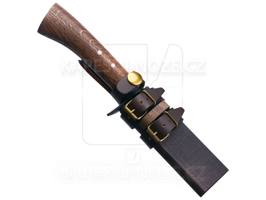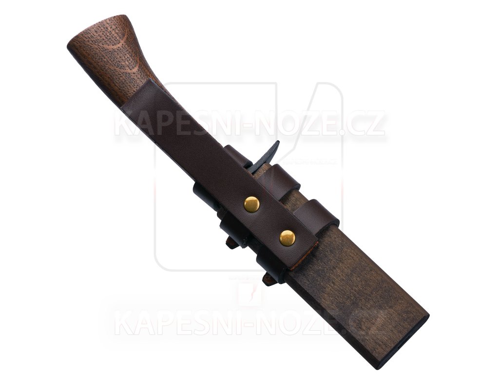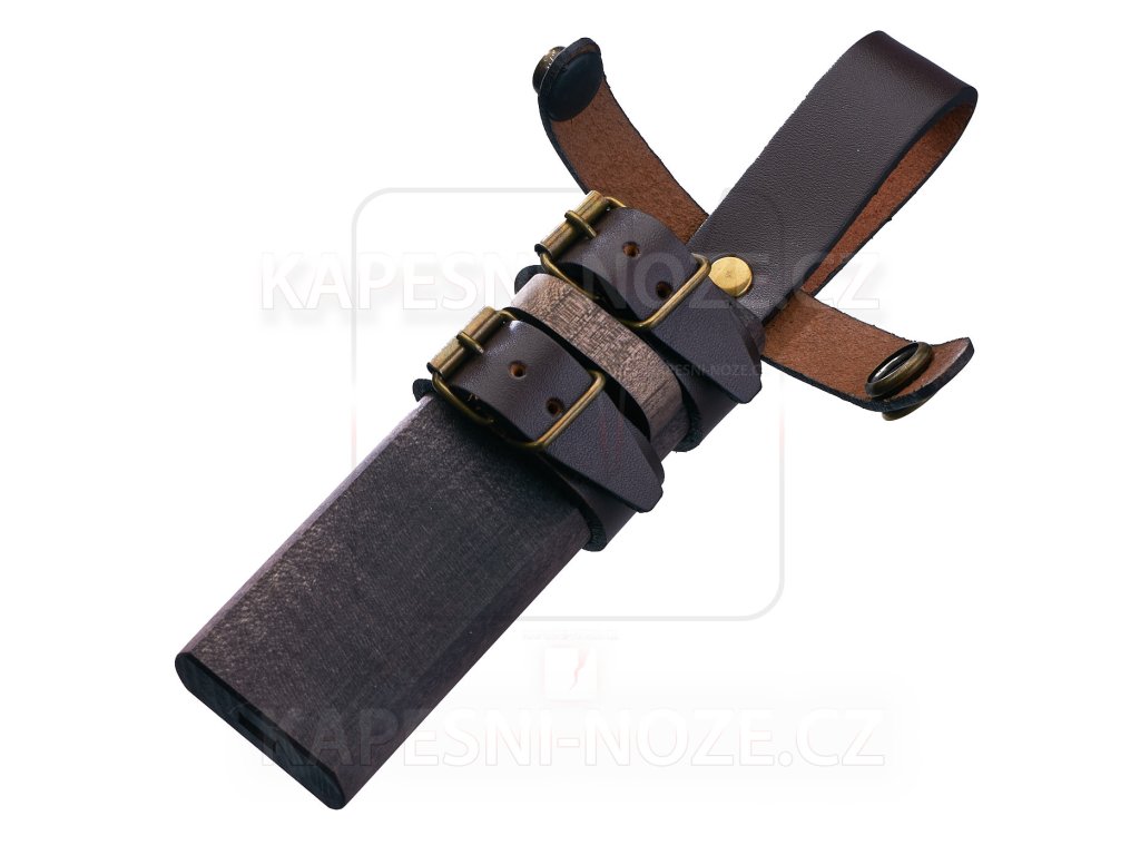 Pouzdro: dubová dřevěná pochva mořená olejem + kožený pásek (čokoládová barva)
