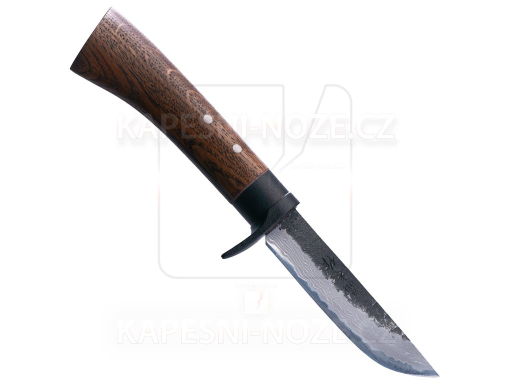 Pevný nůž z dílny Toyokuni Japan vznikl v rukou mistra Akiyuki a nese rukopis tradiční japonské nožířské školy s moderním technickým přesahem. Čepel kombinuje vrstvený damašek s jádrem z uhlíkové oceli Blue 2, která vyniká jemnou strukturou zrna, vysokou stabilitou ostří a charakteristickým řezným projevem. Vícevrstvá skladba přináší zvýšenou houževnatost i odolnost proti bočnímu namáhání, zatímco tvrdší jádro udržuje dlouhodobě agresivní ostrost vhodnou pro přesnou práci.
