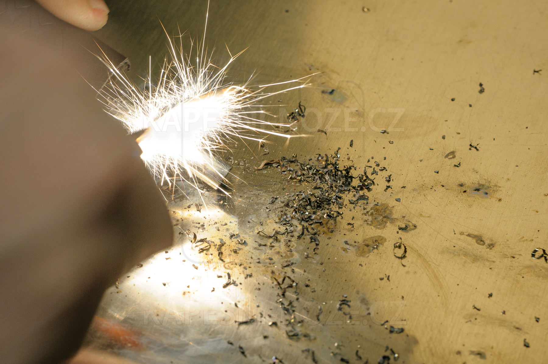 Rychlým seškrábnutím odlétnou jiskry, které díky své velmi vysoké teplotě dokážout zažehnout připravený troud.
