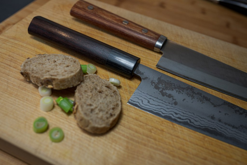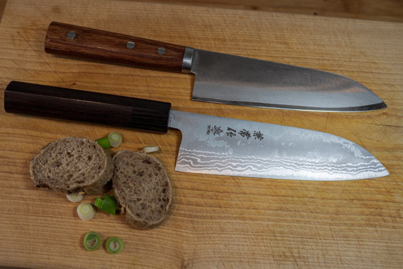 Pokud byl citelný rozdíl mezi evropským ostřím s poměrně širší čepelí u fazety a klasickým japonským nožem, tak tady už v porovnání dvou modelů japonských nožů není takový skok, spíše vystupňování ostrosti. Do čerstvého pečiva pak při řezu nůž zajede tak, že se skoro polekáte.