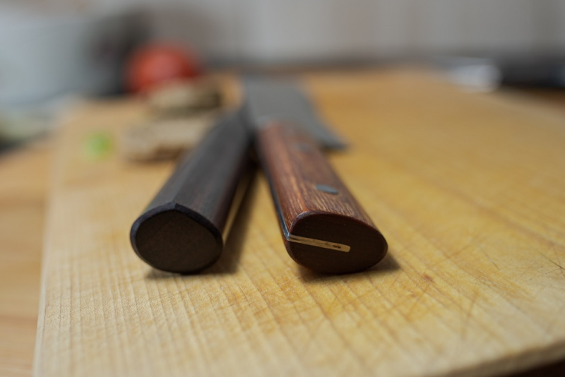 Rukojeti, která je oválná, a už při prvotním uchopení znatelně odlišná od klasických evropských nožů. Po krátkém čase člověk dozná promyšlenost tohoto jednoduchého provedení. Oválný tvar se velice pohodlně drží, neklouže, máte jistotu úchopu a také volnost různorodého držení poměrně dlouhé rukojeti. Ať už pro drobné prokrajování špičkou, tak I pro klasické krájení oceníte variabilitu držení nože, kde nejste svázáni výkrojem klasické ručky, na které jste zvyklí. Nůž je tedy zejména vhodný i pro velké ruce.