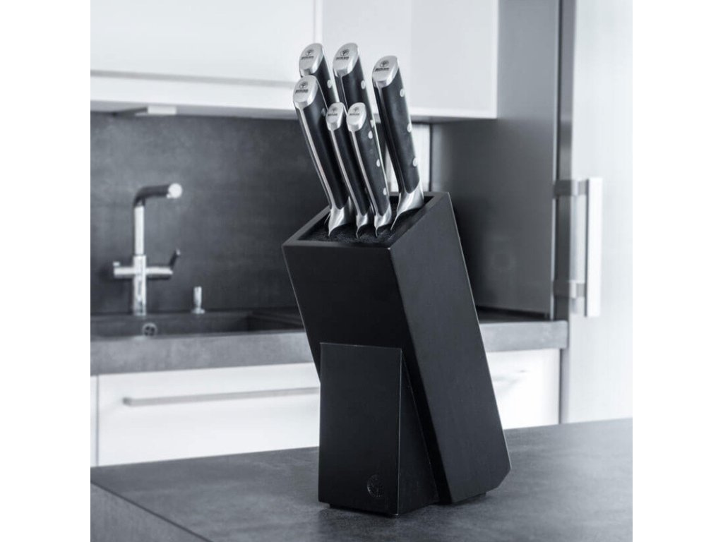 Blok nožů Böker Gusto je vybaven šesti noži řady Böker Forge: špikovacím nožem, univerzálním nožem, nožem na šunku, nožem Santoku, kuchařským nožem a nožem na chleba.