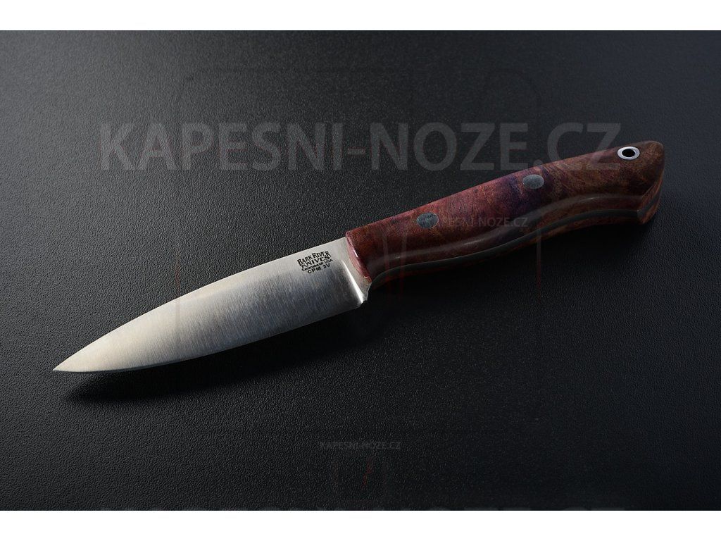 Model Bark River Mini Aurora 3V s rukojetí z materiálu Salmon Maple Burl představuje kompaktní nůž, navržený s důrazem na maximální ovladatelnost a spolehlivost v terénu. Čepel dlouhá přibližně 94 mm je vyrobena z prémiové nástrojové oceli CPM 3V, která vyniká extrémní houževnatostí a vysokou odolností proti prasknutí. Tato ocel je optimalizovaná pro náročné použití, zvládá hrubší zacházení a minimalizuje riziko štípnutí nebo vyštípnutí při práci se dřevem.