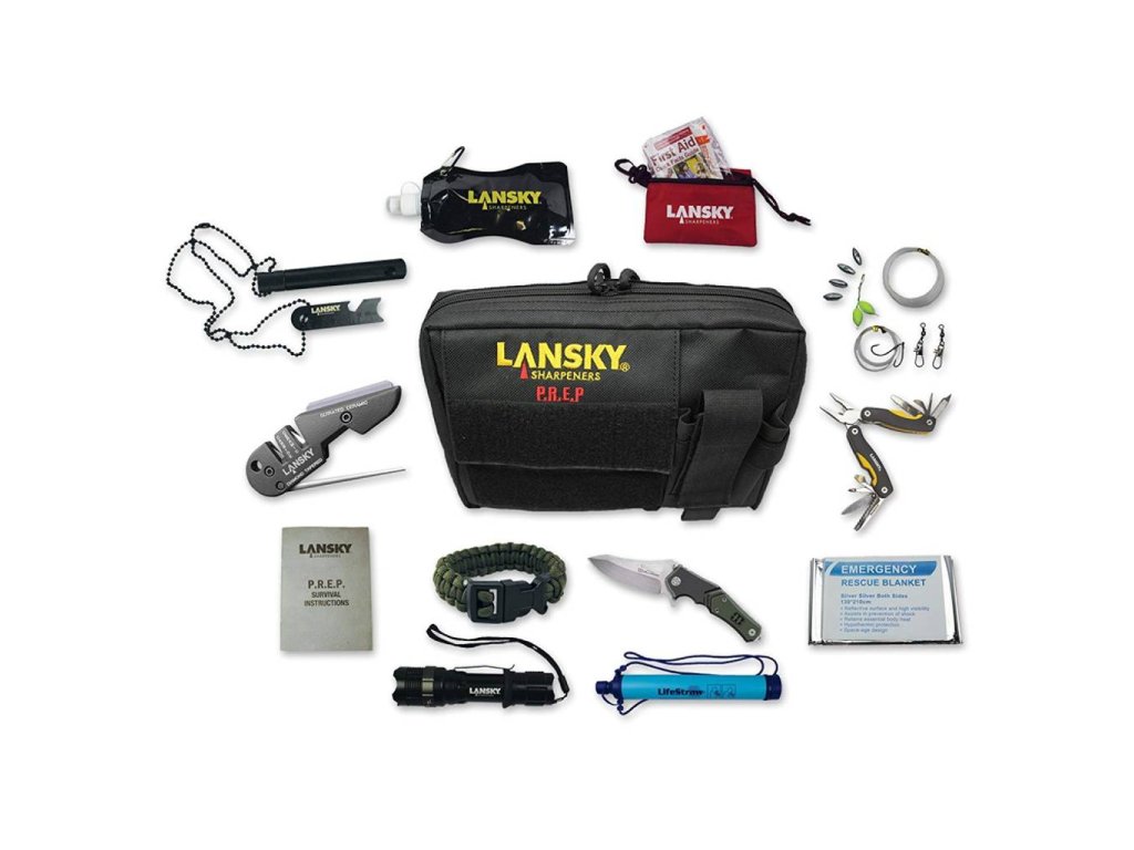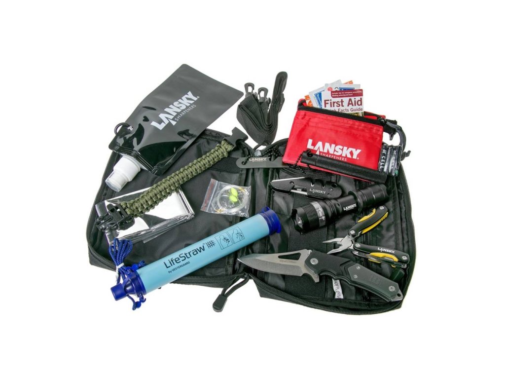 Obsahuje: nouzovou deku, minibrašnu první pomoci, mini multifunkční nástroj, rybářský vlasec, háček, splávek, obratlíky, svítilnu, paracordový náramek, příručku pro přežití Lanksy, podpalovač s kompasem, skládací láhev na vodu, vodní filtr LifeStraw, nůž Responder UTR7 a kombinovaný brousek Blademedic. Dodává se v černé plátěné tašce.